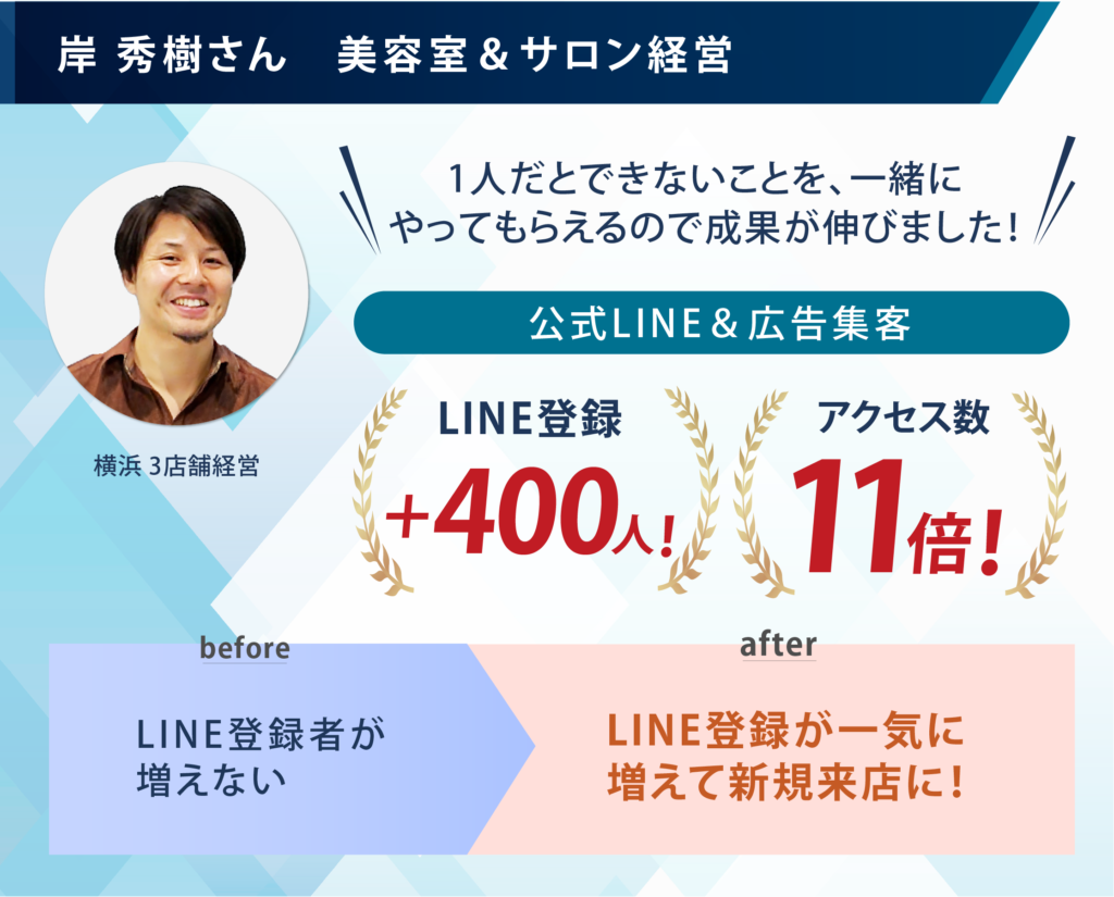 クライアントさんからは「こんな集客ノウハウ初めて知った!」と言われたり、「山口さんの指導は丁寧で分かりやすい」「費用対効果が数十倍!」などと言われる。